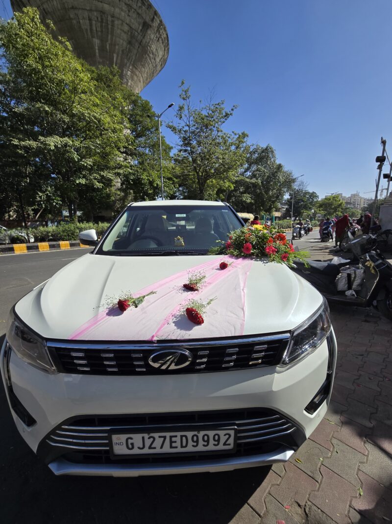 car decoration with originoal flowers. sun flowers multi colours with front pink net..